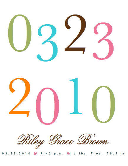 5. Adjust the fonts and colors to suit your fancy.  I chose Bakersville (size 250) for the numbers, Old Script for the name (adjust to make the name look right), and Futura (size 13) for the stats at the very bottom.  The colors I used go well with Riley's room (though I'm debating about the orange).